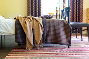 Komfortowo urządzone studio dla 2 osób o powierzchni ok 25 m kw. Prywatna łazienka z prysznicem – w niej ręczniki i suszarka do włosów. Dobrze wyposażony aneks kuchenny – lodówka, kuchenka elektryczna, zlewozmywak – oraz stół z miejscem dla 4 osób. W pokoju wygodne łóżko małżeńskie szer. 160 cm i zmysłowy fotel do poczytania przy nastrojowej lampie. Z okien widok na rozległy ogród, pola za domem i niewielki las.
